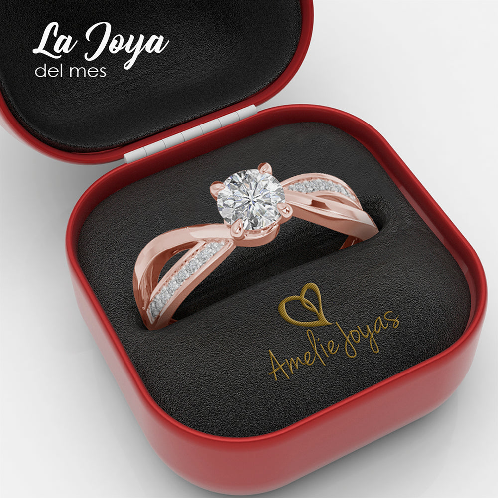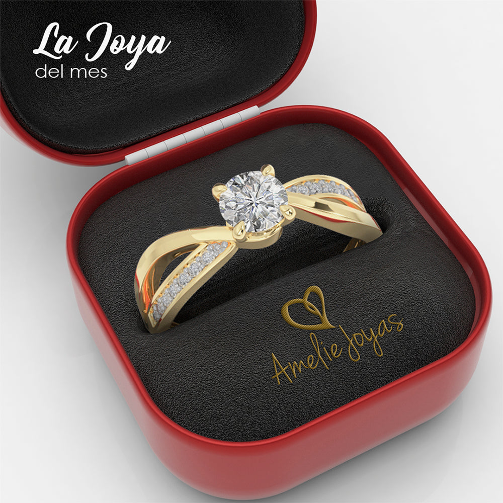 Anillo de compromiso en oro sólido, disponible en 10k, 14k y bajo pedido especial en 18k, deslumbra con una zirconia central de alto brillo, escoltada por delicadas zirconias laterales que reflejan cada emoción.