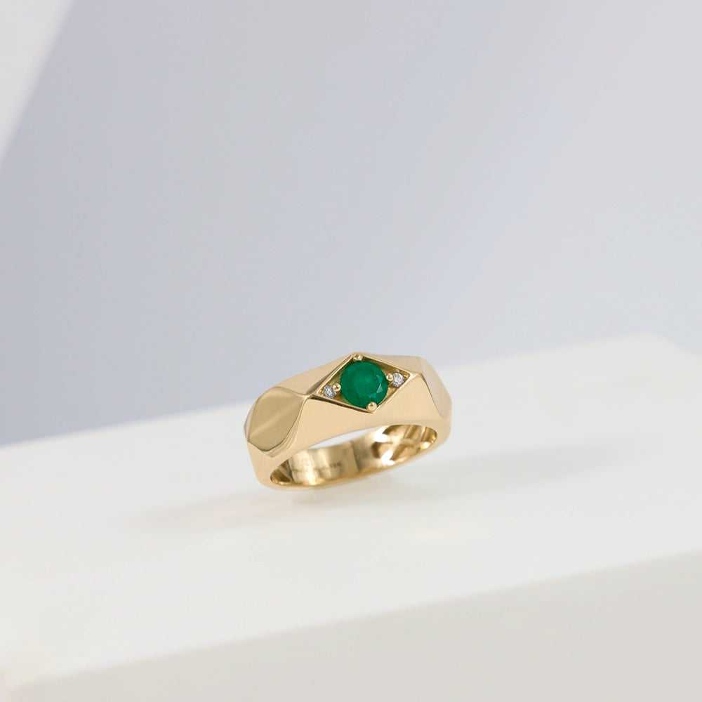 Distinción y carácter en cada detalle: Anillo de caballero en oro sólido, con una imponente esmeralda natural al centro, enmarcada por zirconias laterales dentro de un elegante diseño en forma de rombo. Una joya que refleja fuerza, estilo y exclusividad.