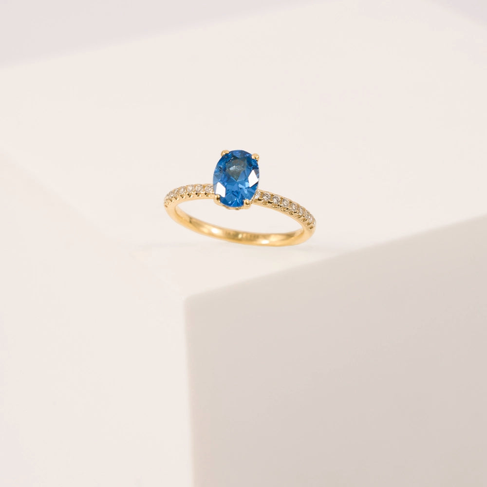 Anillo de compromiso en oro sólido con zirconia central azul oval y pequeñas zirconias brillantes a los laterales que acentúan su resplandor. Una joya distintiva y sofisticada, símbolo de un amor profundo y eterno.