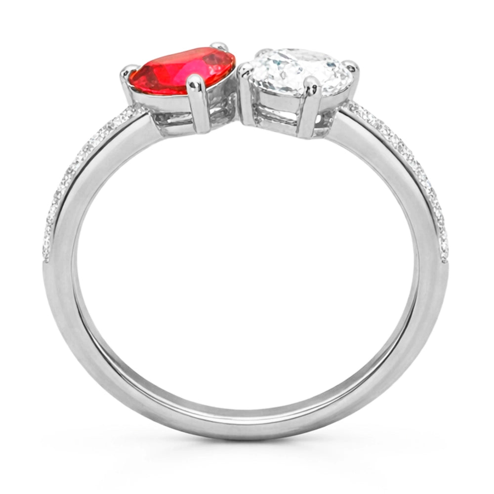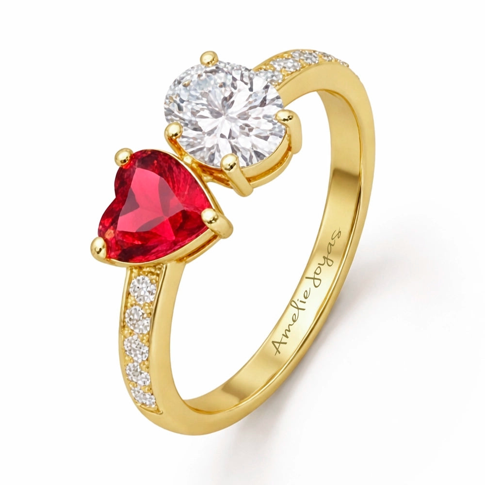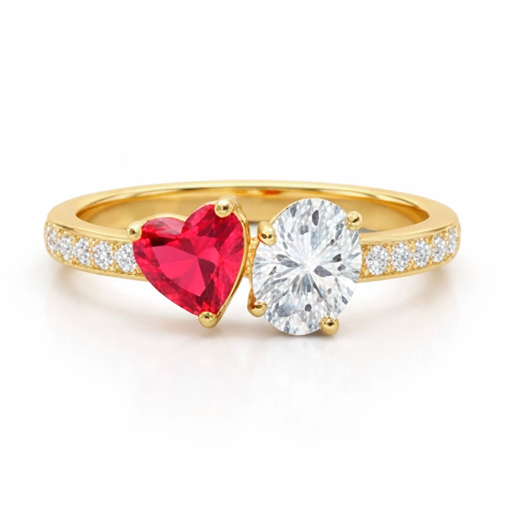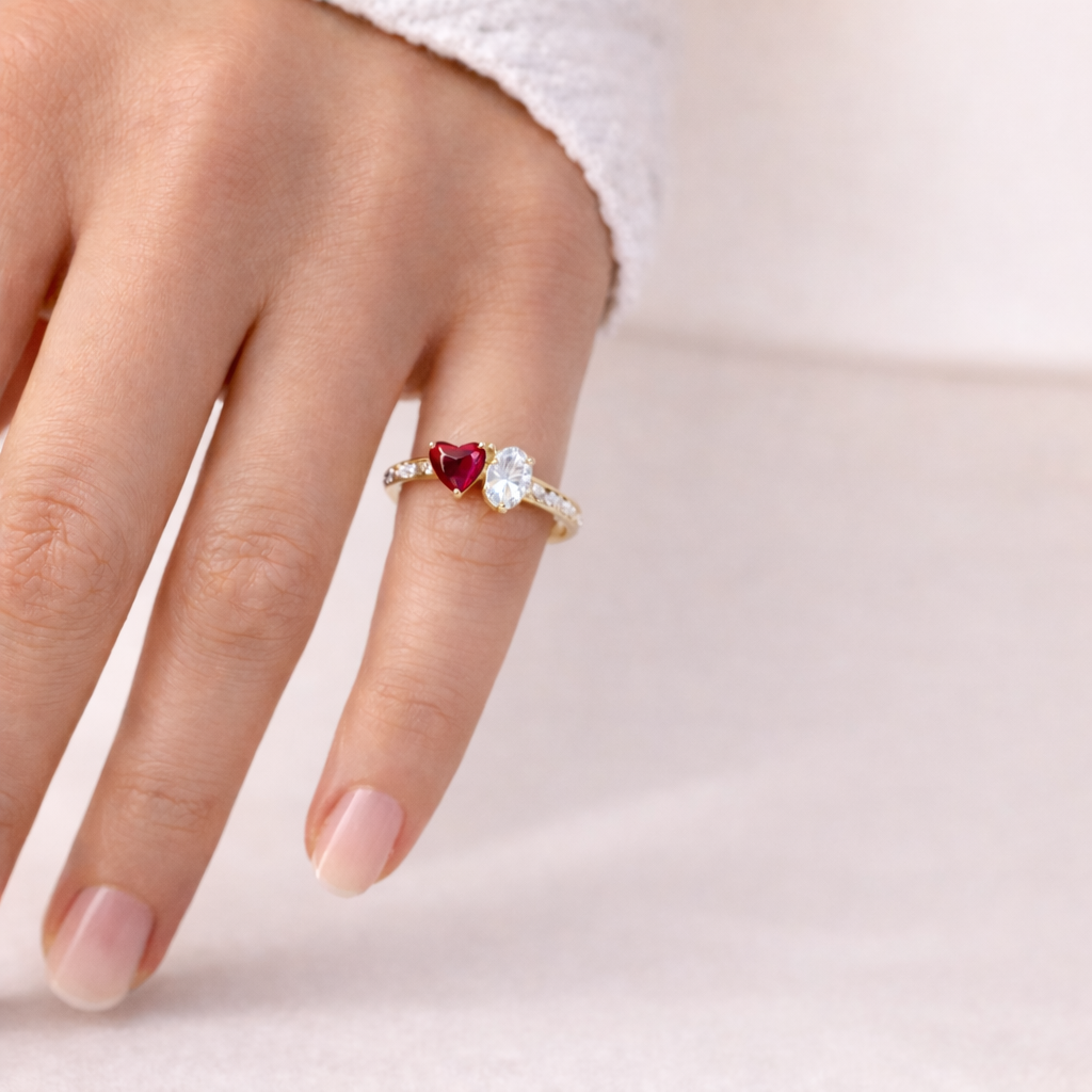 Anillo con piedras centrales en forma de corazón y oval, acompañado de piedras laterales en el cuerpo, diseñado para reflejar sofisticación y brillo equilibrado. Una joya única que combina romance, armonía y elegancia atemporal.
