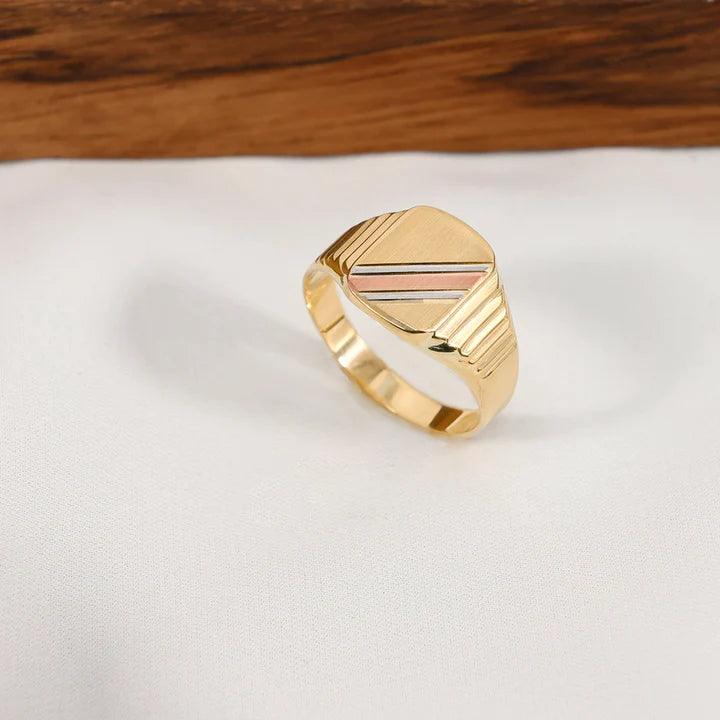 Anillo de Caballero en Oro con Diseño plano Satinado al frente y franjas Transversales en Oro Florentino que realzan su brillo y carácter. Una joya de estilo sofisticado y varonil, ideal para destacar con distinción