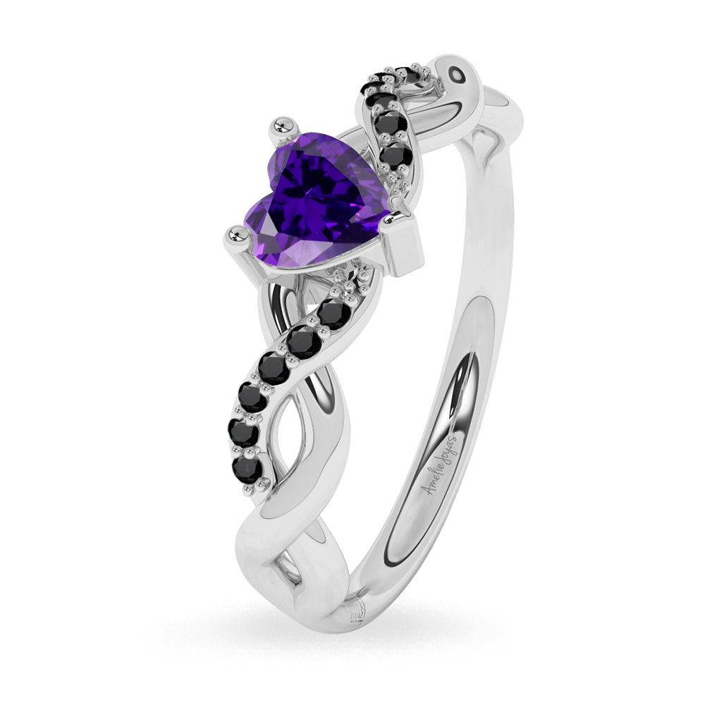 Anillo de Compromiso en Oro, con Zirconia Central Morada en forma de Corazón que simboliza el amor eterno, acompañada de delicadas zirconias negras laterales que realzan su esplendor. Una joya sofisticada y única, perfecta para sellar el amor con elegancia y distinción.