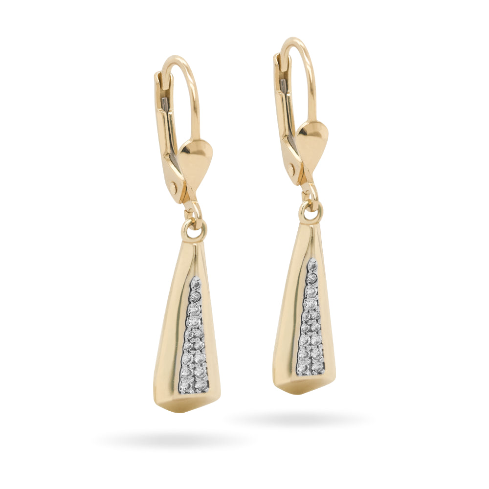 Hermosas Aretes colgantes de Oro Amarillo forma triangular con zirconias, diseño elegante, simple y moderno que garantiza estilo y comodidad al usarlos, con broche estilo romano.