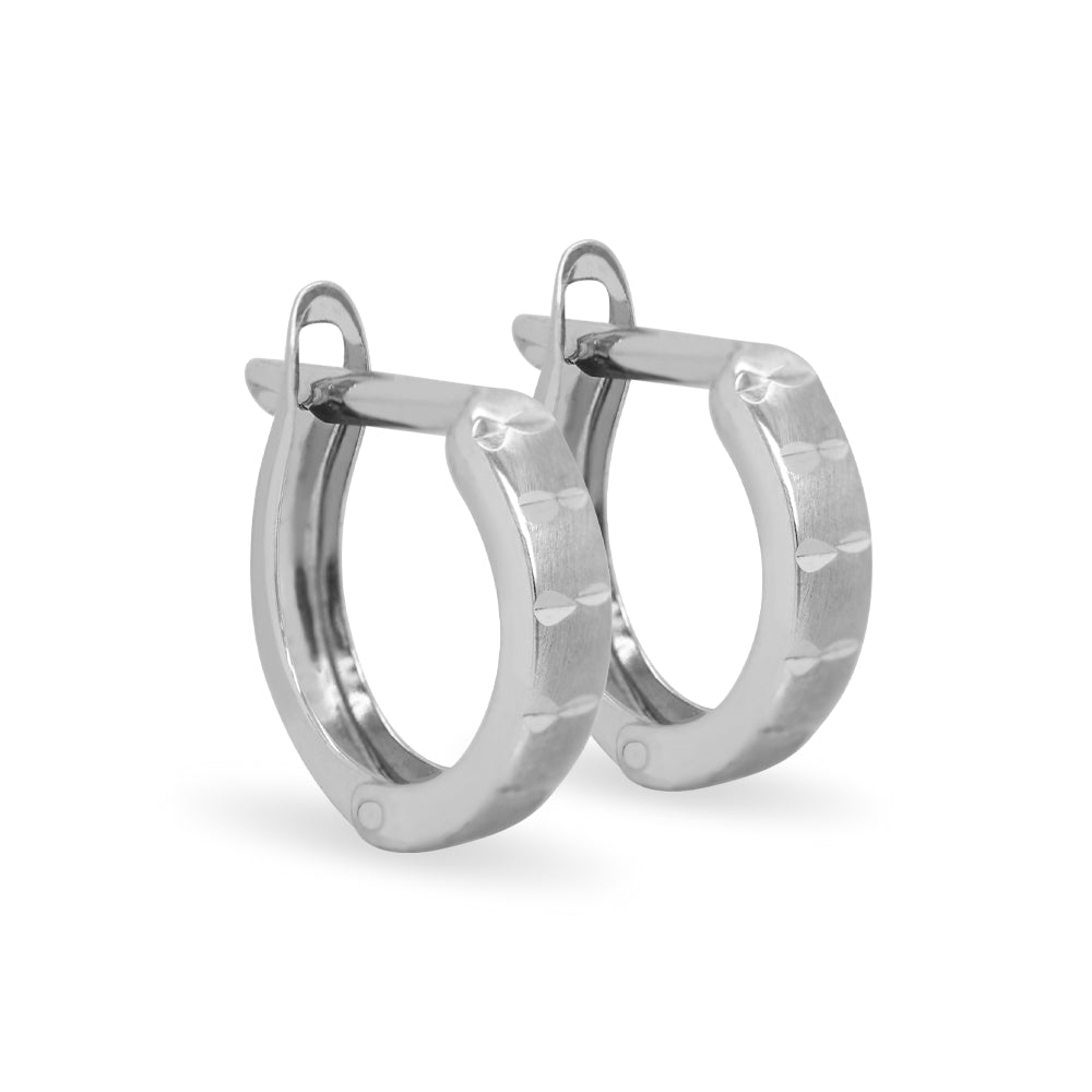 Hermosos aretes Huggies de Oro blanco acabado Texturizado, con un diseño elegante, simple y moderno que garantiza estilo y comodidad al usarlos, con broche estilo catalán.