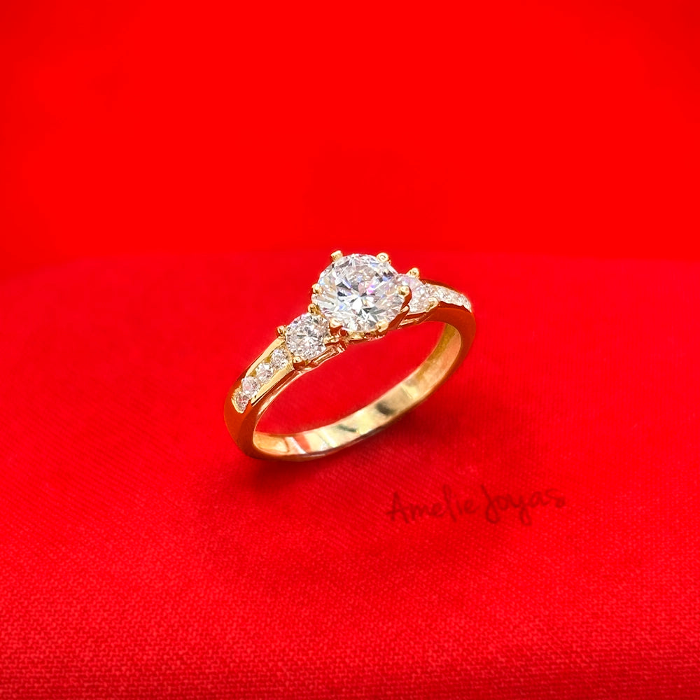 Anillo de compromiso en oro sólido, disponible en 10k, 14k y bajo pedido especial en 18k, deslumbra con una zirconia central de alto brillo, escoltada por delicadas zirconias laterales que reflejan cada emoción.