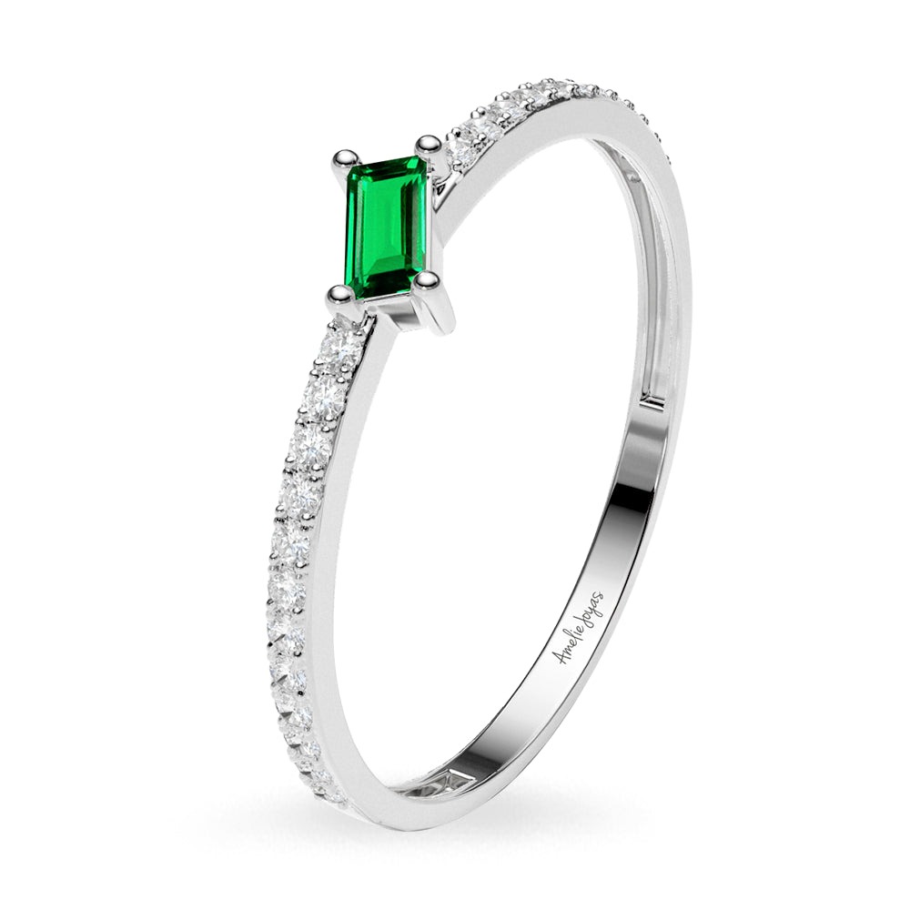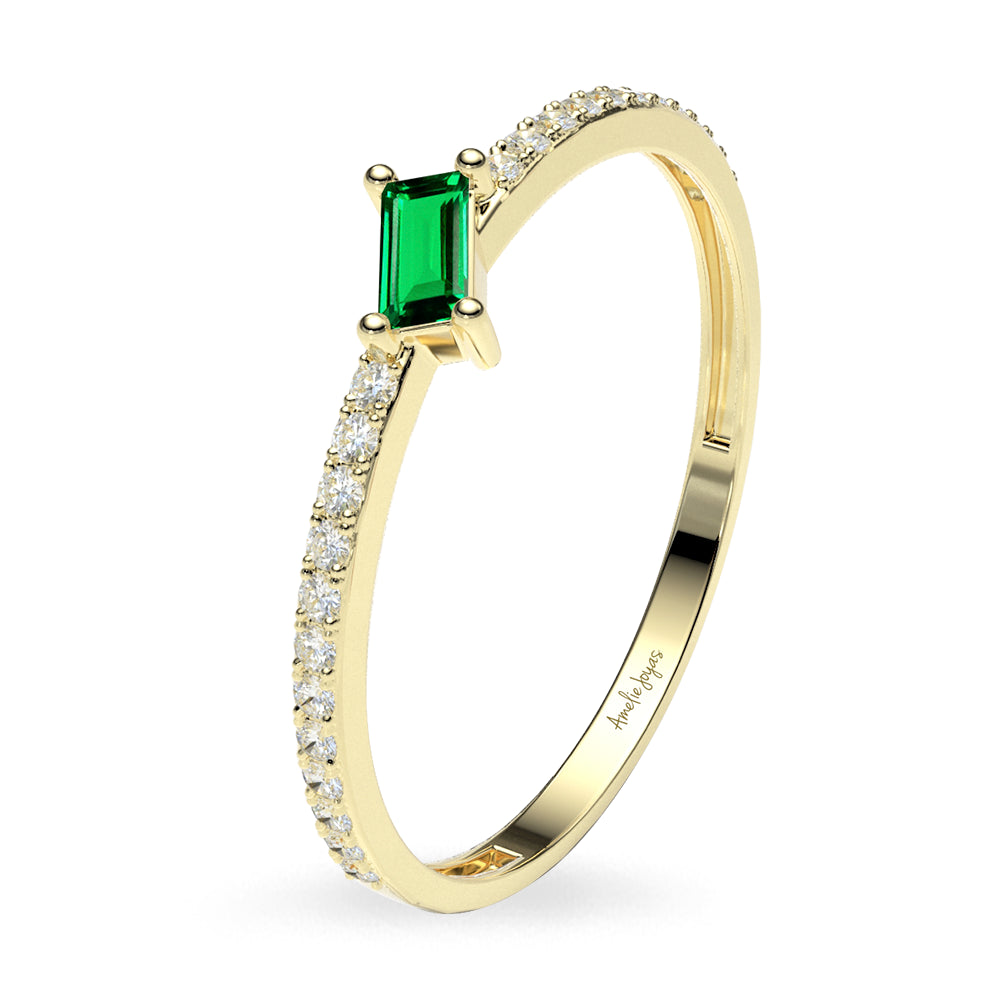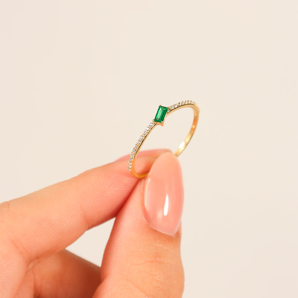 Anillo de Dama en Oro Sólido, con una Deslumbrante Zirconia Central en corte Baguette color Verde que irradia sofisticación, realzada por pequeñas zirconias laterales que aportan brillo y armonía. Una joya moderna y elegante, perfecta para destacar con estilo y distinción.