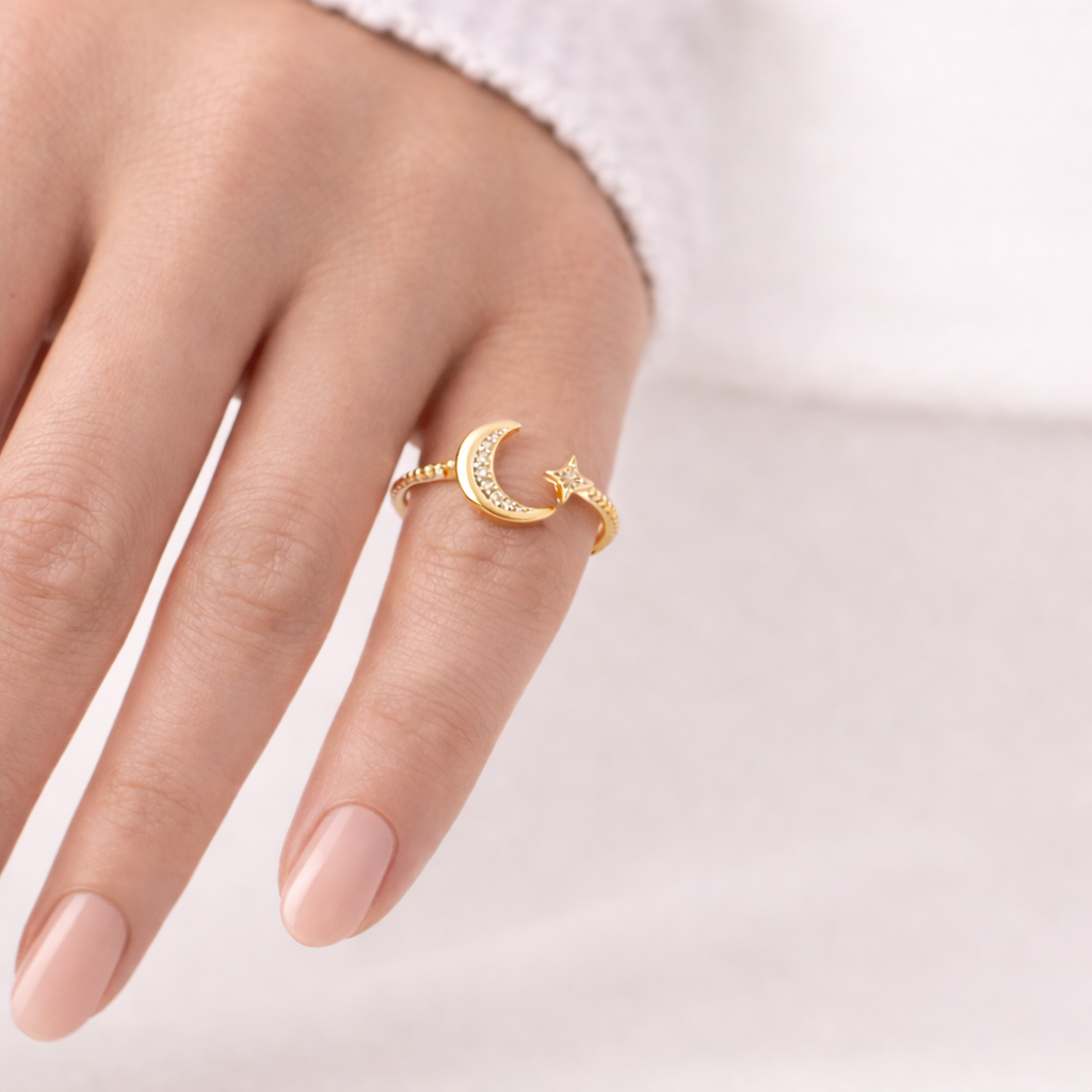 nillo con cuerpo en forma de media luna y delicadas piedras, diseñado para reflejar misterio, elegancia y brillo sutil. Una joya sofisticada que realza tu estilo con un encanto celestial y atemporal.