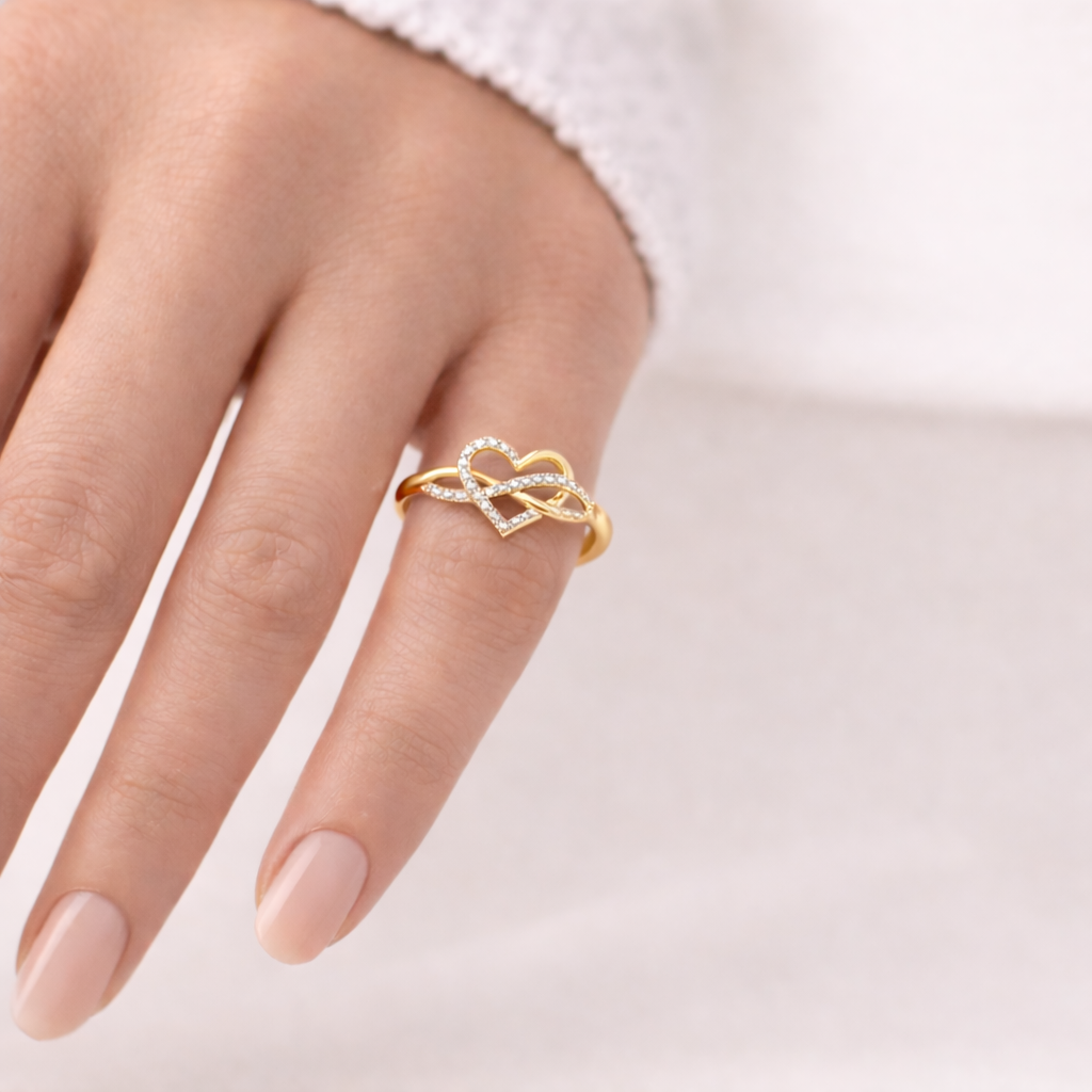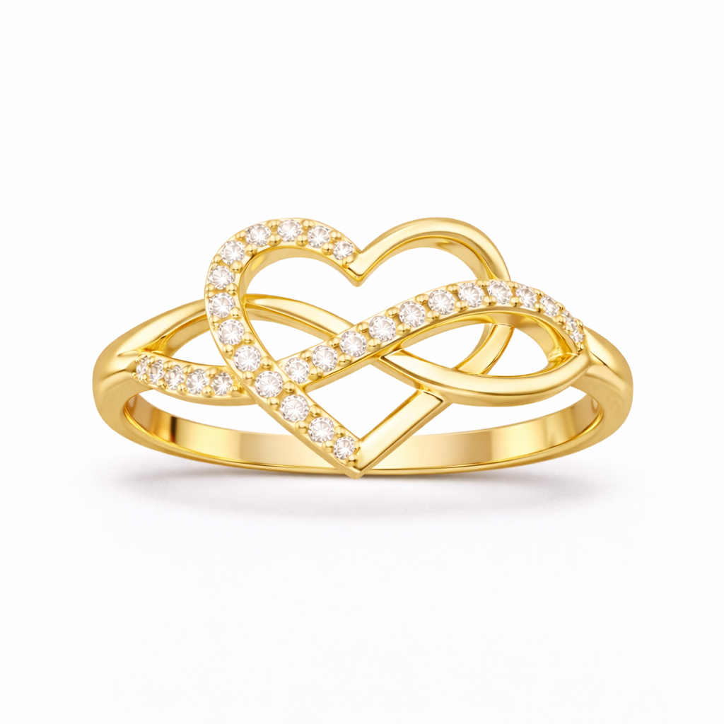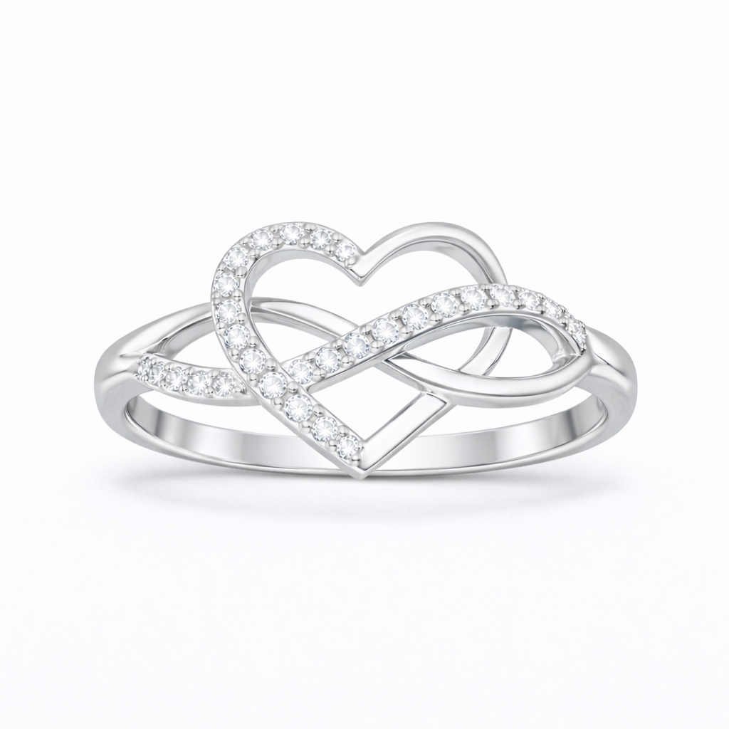 Anillo con cuerpo en forma de infinito, corazón central y delicadas piedras, diseñado para simbolizar amor eterno y conexión infinita. Una joya sofisticada que une significado y brillo en un diseño atemporal.